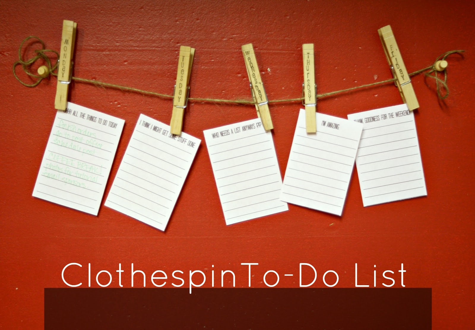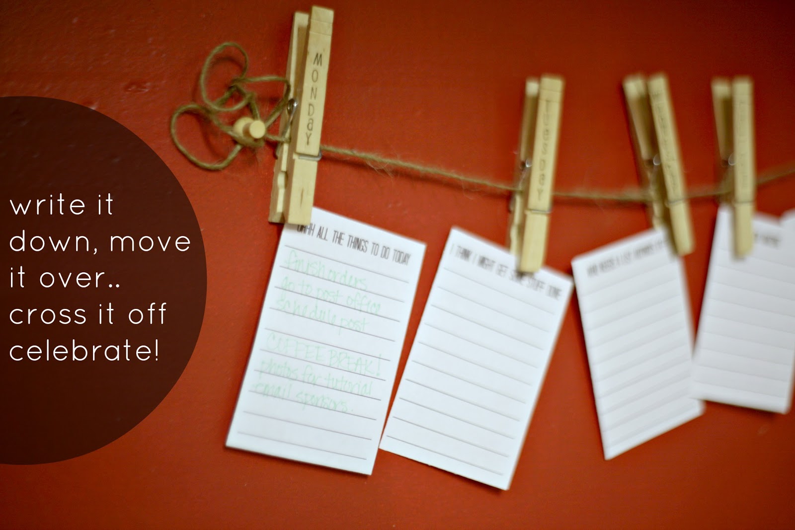 Set those clothespins aside to dry and print out your to-do list or make your own! This prints out on a normal size sheet of paper (portrait style) and when cut you will have five 2 1/2″ x 4″ cards to make your list. You can map out your entire week with items to get done or start with one day then each morning make a new list to work on. Write it down, move it over, cross it off & celebrate!