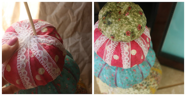 After all of your pumpkins are done, decide if you want to add a little more to your pumpkin. If yes, grab some extra bits of sewing notions and start decorating! Fabric-covered pumpkins are easy to customize & make a statement with… so have fun! I added ribbon and lace to each pumpkin for some added texture.