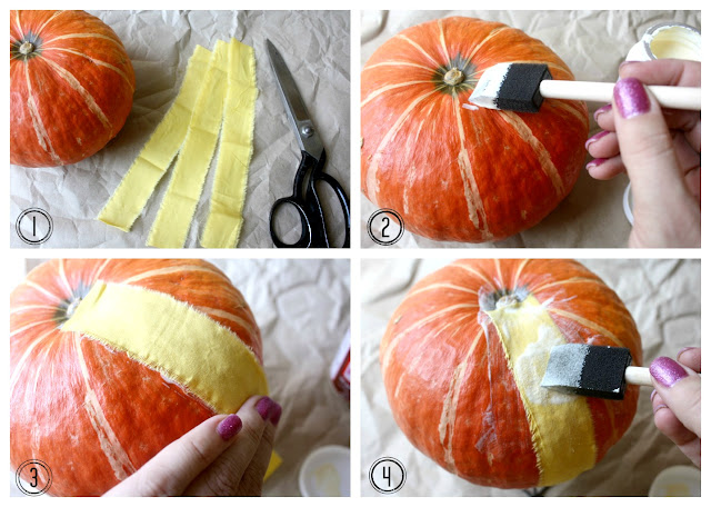 Instructions: 1. Gather enough stripes to cover your pumpkin from stem to bottom and all the way around. 2. Lightly brush a thin layer of Mod Podge where you will place your first strip 3. Place a strip firmly onto the pumpkin 4. Cover strip with a generous layer of Mod Podge — repeat all the way around until the pumpkin is covered, set aside and allow to dry.