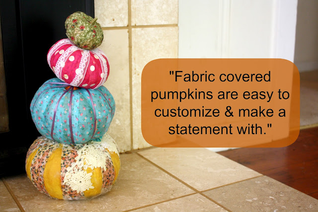 Supplies: Pumpkins (real or fake; its up to you… I used both!), fabric scraps, mod podge, applicator brush/sponge, and a wood skewer to stack the pumpkins for display. For optional decor you can add in ribbon or lace appliques.