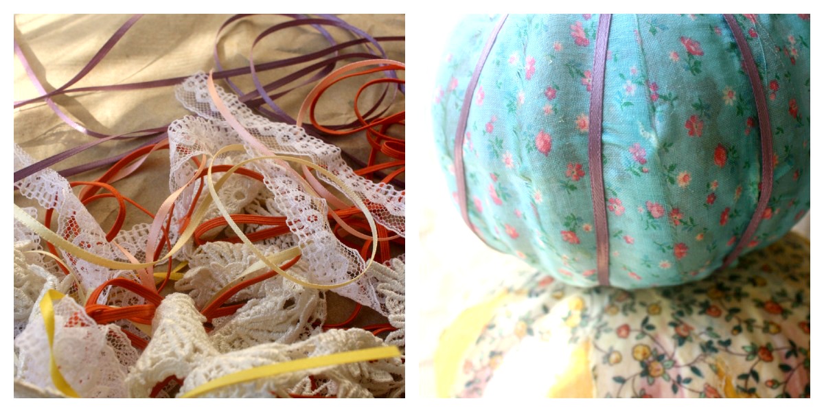After all of your pumpkins are done, decide if you want to add a little more to your pumpkin. If yes, grab some extra bits of sewing notions and start decorating! Fabric-covered pumpkins are easy to customize & make a statement with… so have fun! I added ribbon and lace to each pumpkin for some added texture.