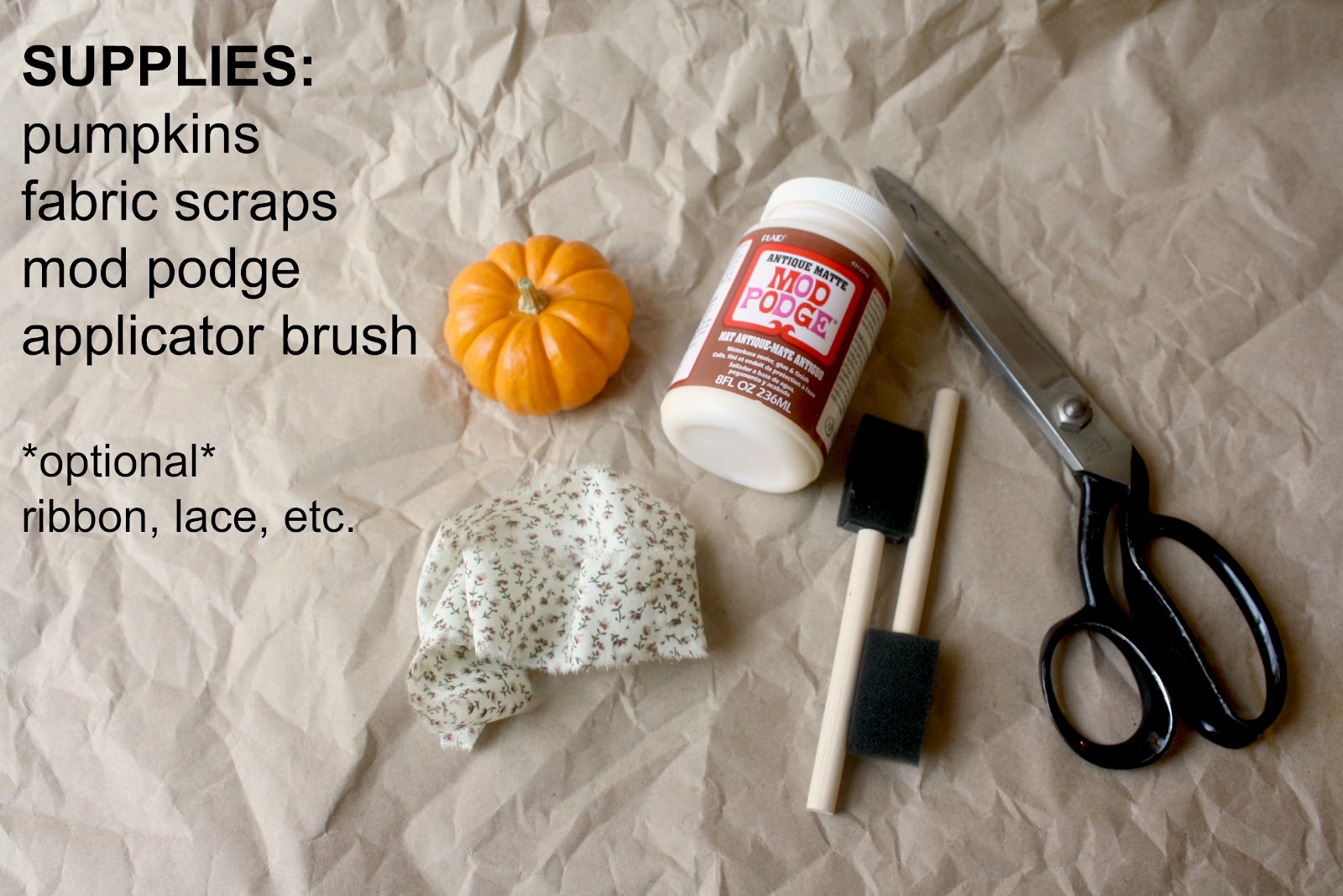 Supplies: Pumpkins (real or fake; its up to you… I used both!), fabric scraps, mod podge, applicator brush/sponge, and a wood skewer to stack the pumpkins for display. For optional decor you can add in ribbon or lace appliques.